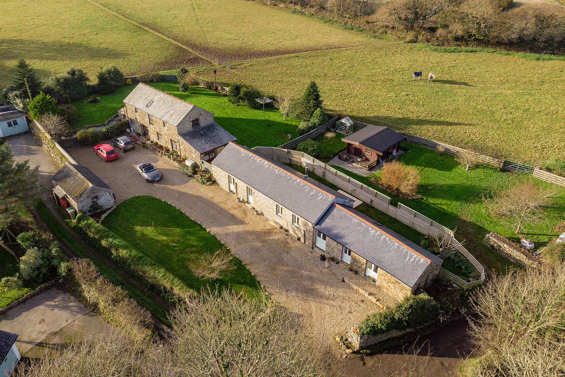 The images below are of Cart Shed Cottage, and shows traditional ground level photography, drone photography, a 360 degree image of the living area, and a floorplan