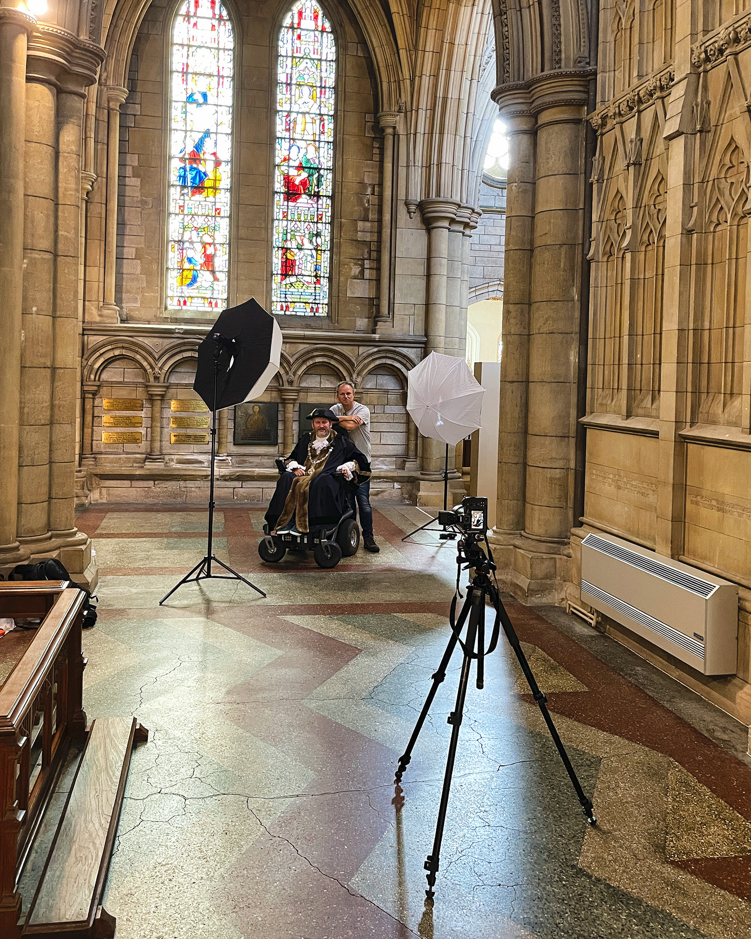 The Mayoral portrait has always been a very traditional affair, with the Mayor dressed in ceremonial regalia, dating back centuries. Remembering what the earlier portraits look like, I was keen to recreate that classical look. With that in mind, the interior of Truro Cathedral was chosen, as I wanted a subtle background in keeping with the regalia, not a modern, harsh, office. Two lights were used (both in umbrellas), one as a key light, and one as a fill/rim light. The background was allowed to go dark, to emphasise the subject.